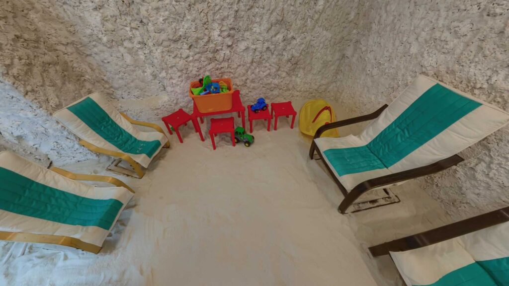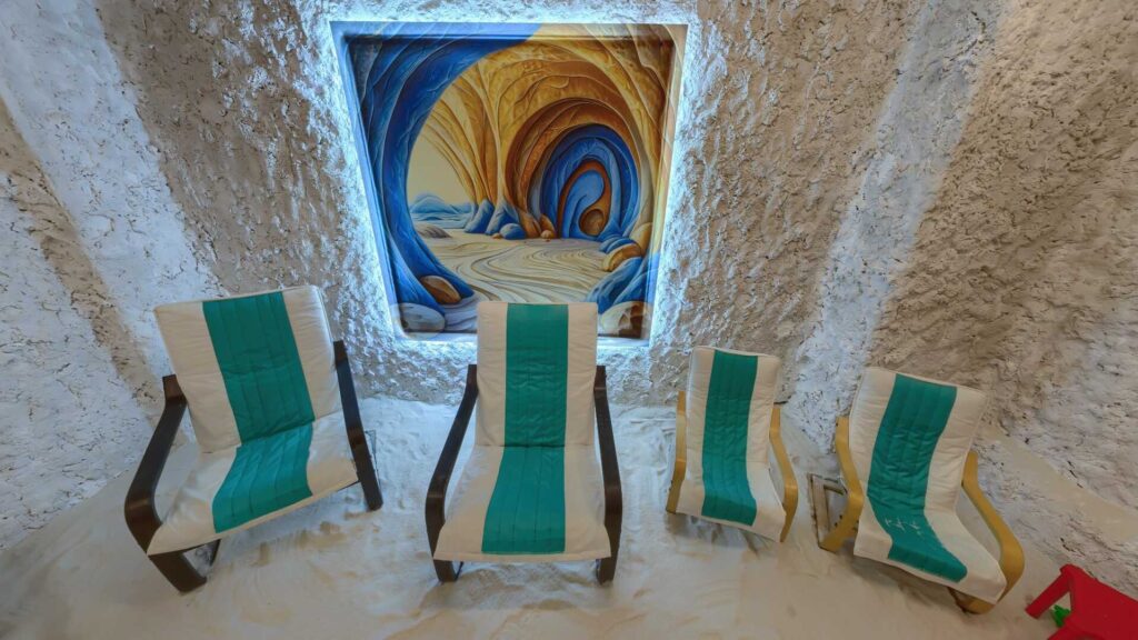 В соляной пещере принимают удобную позу (сидя) и проводят процедуру по дозированному графику. Не запрещается передвигаться по соляной пещере во время сеанса, однако мы просим Вас уважать других и не создавать им дополнительного неудобства таким передвижением и разговорами.